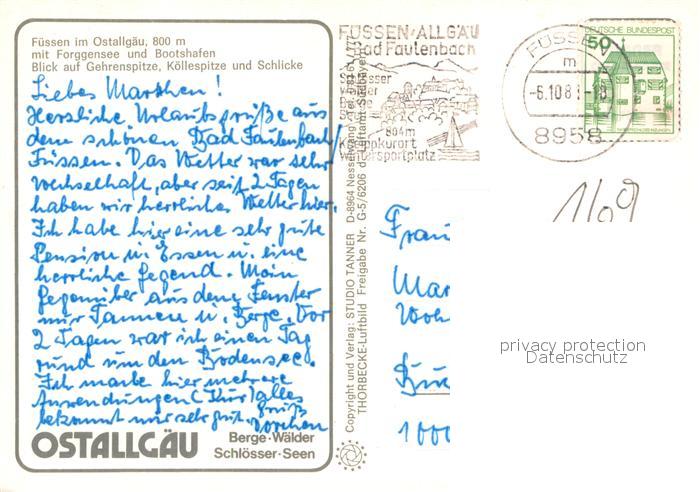 73682122 alte Postkarte Fuessen Allgaeu Fliegeraufnahme mit Forggensee Bootshafen Gehrenspitze Koellespitze und Schlicke postalisch gelaufen Erhaltung siehe scans [WerneD78] KatCode: 11110009777129