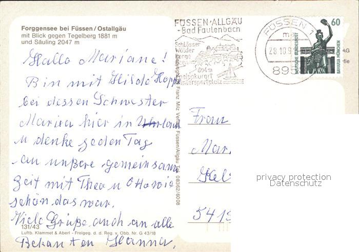 71899757 alte Postkarte Fuessen Allgaeu Forggensee Blick gegen Tegelberg und Saeuling Fliegeraufnahme postalisch gelaufen Erhaltung siehe scans KatCode: 11110009777129