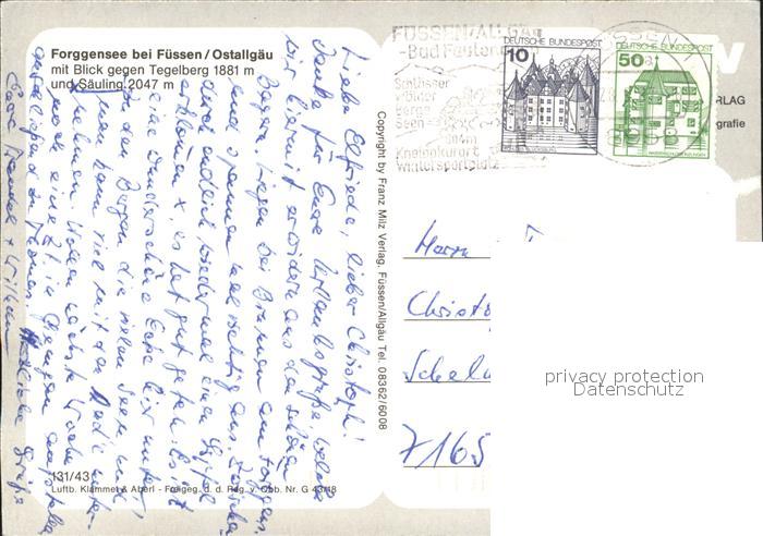 72296873 alte Postkarte Fuessen Allgaeu Forggensee mit Blick gegen Tegelberg und Saeuling Fliegeraufnahme postalisch gelaufen Erhaltung siehe scans KatCode: 11110009777129