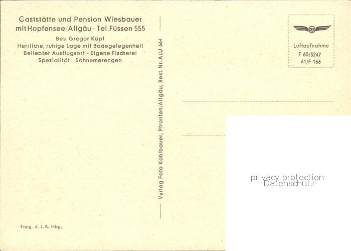 72420703 Fuessen Allgaeu Gaststaette Pension Wiesbauer Hopfensee Fliegeraufnahme postalisch nicht gelaufen Erhaltung siehe scans KatCode: 11110009777129