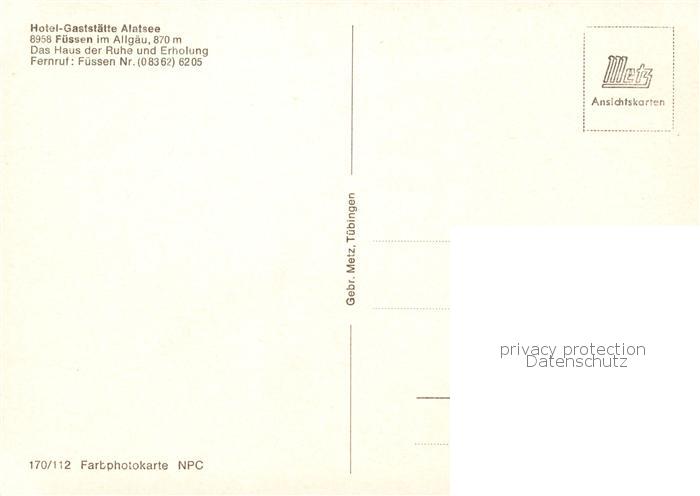 73864877 Fuessen Allgaeu Hotel Gaststaette Alatsee postalisch nicht gelaufen Erhaltung siehe scans [FriedD77] KatCode: 11110009777129