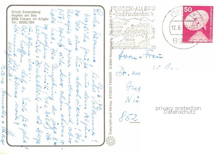 72761894 alte Postkarte Fuessen Allgaeu Klinik Enzensberg postalisch gelaufen Erhaltung siehe scans [LiesaD40] KatCode: 11110009777129