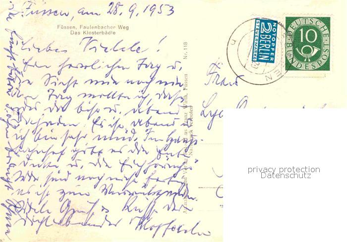 72776489 alte Postkarte Fuessen Allgaeu Klosterbaedle postalisch gelaufen Erhaltung siehe scans [KathaD81] KatCode: 11110009777129