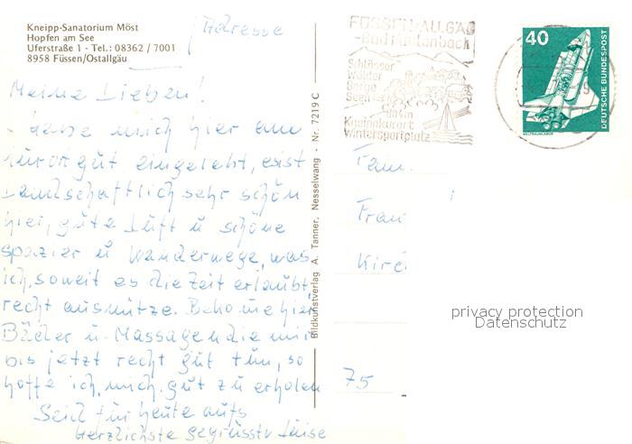 72941107 alte Postkarte Fuessen Allgaeu Kneipp-Sanatorium M?st Hopfrn am See postalisch gelaufen Erhaltung siehe scans [LiesaD40] KatCode: 11110009777129