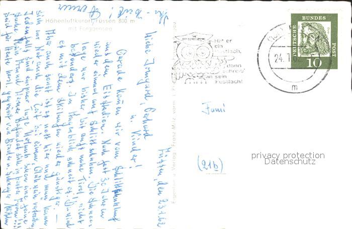 72063045 alte Postkarte Fuessen Allgaeu mit Forggensee postalisch gelaufen Erhaltung siehe scans KatCode: 11110009777129