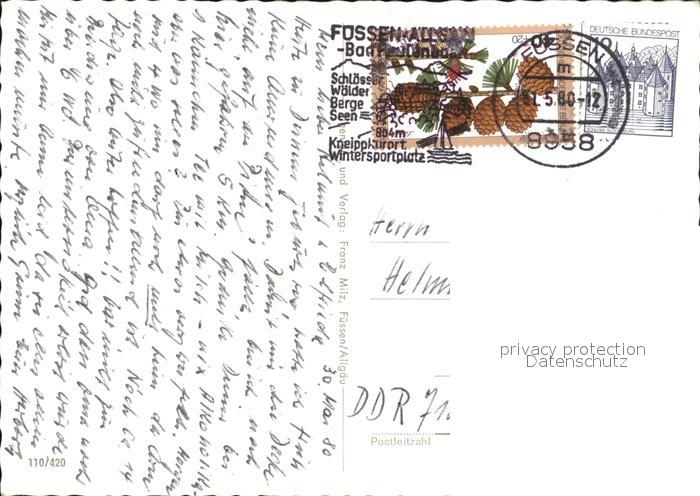72568318 alte Postkarte Fuessen Allgaeu mit Schloss Hohenschwangau postalisch gelaufen Erhaltung siehe scans [LiesaD40] KatCode: 11110009777129