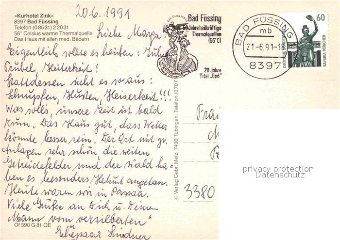 72699064 alte Postkarte Fuessing Bad Kur Hotel Zink postalisch gelaufen Erhaltung siehe scans [KathaD79] KatCode: 11110009275116