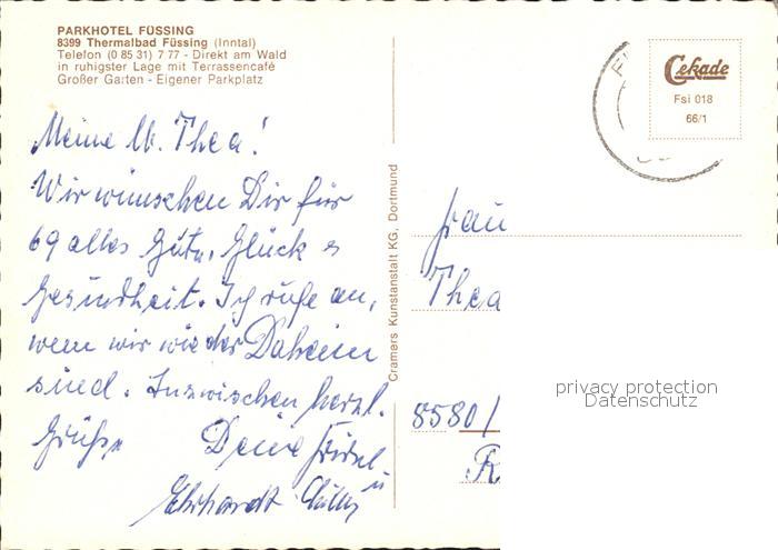 72549753 alte Postkarte Fuessing Bad Parkhotel postalisch gelaufen Erhaltung siehe scans [AndreD76 kv022box] KatCode: 11110009275116