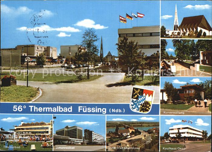 72605498 alte Postkarte Fuessing Bad Thermalbad Kirche Kurzentrum Kurverwaltung Kaufhaus Innbruecke Johannesbad postalisch gelaufen Erhaltung siehe scans [FriedD77] KatCode: 11110009275116