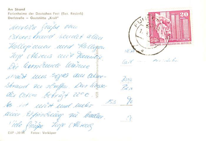 73887622 alte Postkarte Fuhlendorf Darss Ribnitz-Damgarten Strand Ferienheime der Deutschen Post Dorfstrasse Gaststaette Krull postalisch gelaufen Erhaltung siehe scans [FriedD77] KatCode: 11110013057029