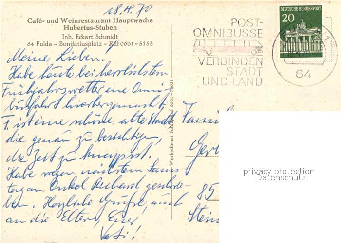 72760931 alte Postkarte FULDA Hessen Cafe Weinrestaurant Hauptwache Hubertus Stuben Bonifatiusplatz Kirche postalisch gelaufen Erhaltung siehe scans [FriedD77] KatCode: 11110006631009