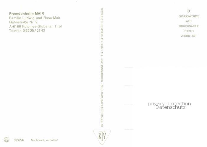 72882088 Fulpmes Tirol Fremdenheim Mair im Stubaital postalisch nicht gelaufen Erhaltung siehe scans [FriedD77] KatCode: 11390332070310