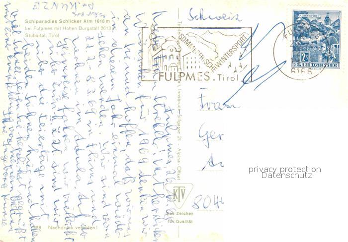 72840117 alte Postkarte Fulpmes Tirol Schlicker Alm mit Hohen Burgstatt postalisch gelaufen Erhaltung siehe scans [WerneD78] KatCode: 11390332070310