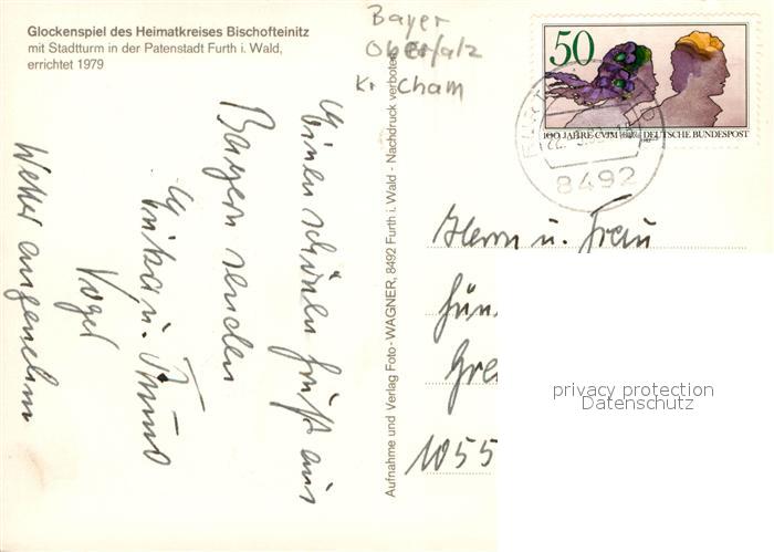 73019486 alte Postkarte Furth Wald Glockenspiel Bischofteintz Stadtturm postalisch gelaufen Erhaltung siehe scans [NatalD47] KatCode: 11110009372126