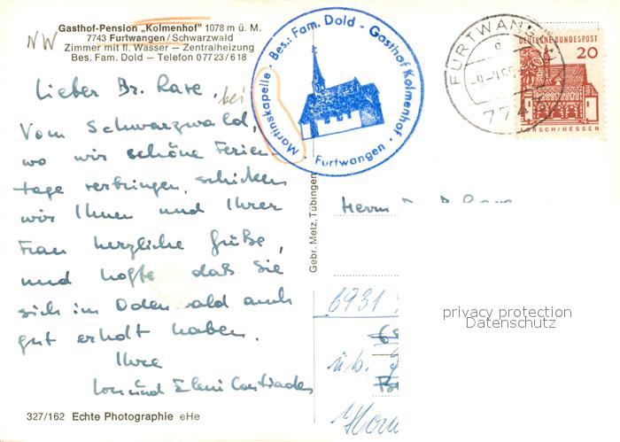73335855 alte Postkarte Furtwangen Gasthof Pension Kolmenhof Kapelle postalisch gelaufen Erhaltung siehe scans [FriedD77] KatCode: 11110008326017
