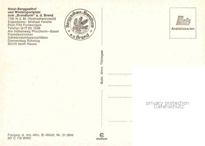 72905422 Furtwangen Hotel-Berggasthof Brendturm postalisch nicht gelaufen Erhaltung siehe scans [NatalD47] KatCode: 11110008326017