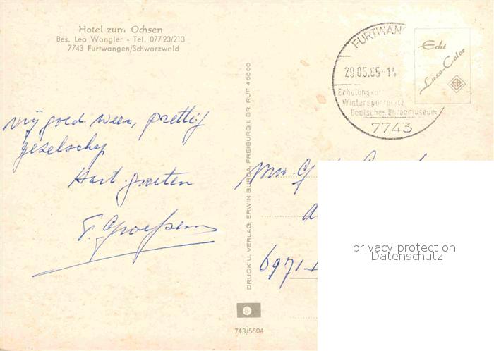 72910009 alte Postkarte Furtwangen Hotel zum Ochsen Restaurant postalisch gelaufen Erhaltung siehe scans [LiesaD40] KatCode: 11110008326017