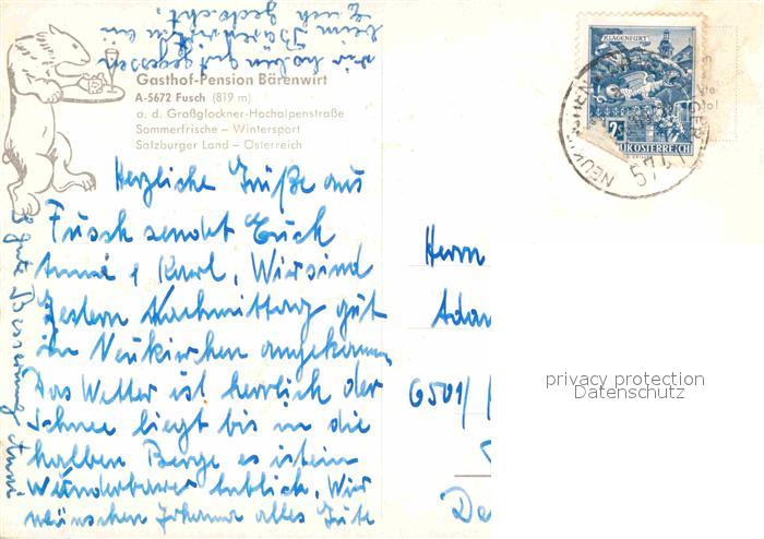 72906831 alte Postkarte Fusch Grossglocknerstrasse Gasthaus Pension Baerenwirt postalisch gelaufen Erhaltung siehe scans [LiesaD40] KatCode: 11390322050604