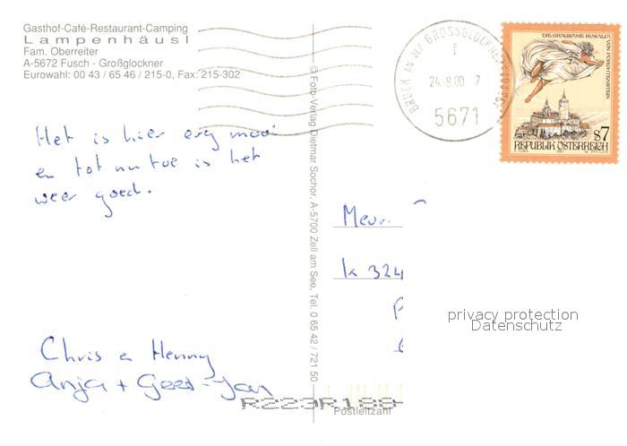 73519013 alte Postkarte Fusch Grossglocknerstrasse Gasthof Restaurant Lampenhaeusl Camping Landschaftspanorama Alpen Grossglockner Hohe Tauern postalisch gelaufen Erhaltung siehe scans [FriedD77] KatCode: 11390322050604