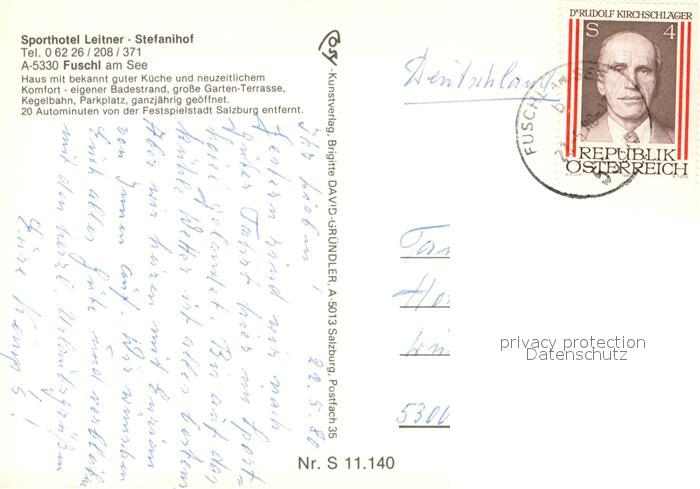 73590850 alte Postkarte Fuschl See Salzkammergut Sporthotel Leitner Stefanihof postalisch gelaufen Erhaltung siehe scans [KathaD81] KatCode: 11390323050312