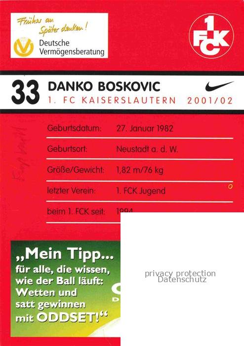 74052057 Fussball Soccer Football– Danko Boskovic FC Kaiserslautern postalisch nicht gelaufen Erhaltung siehe scans [IrynaD87] KatCode: 22520000002900
