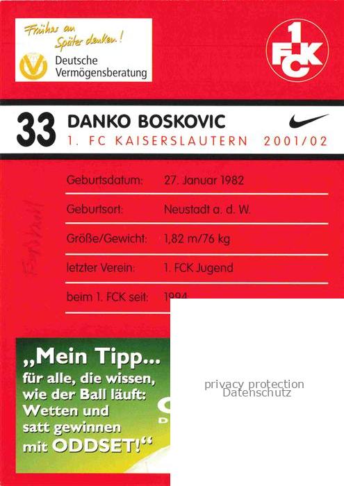 74052052 Fussball Soccer Football– Danko Boskovic FC Kaiserslautern postalisch nicht gelaufen Erhaltung siehe scans [IrynaD87] KatCode: 22520000002900