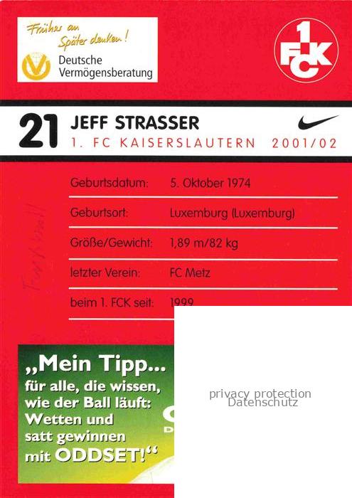 74052071 Fussball Soccer Football– Jeff Strasser FC Kaiserslautern postalisch nicht gelaufen Erhaltung siehe scans [IrynaD87] KatCode: 22520000002900
