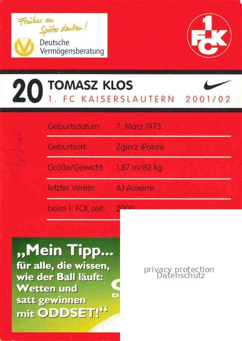 74052073 Fussball Soccer Football– Tomasz Klos FC Kaiserslautern postalisch nicht gelaufen Erhaltung siehe scans [IrynaD87] KatCode: 22520000002900