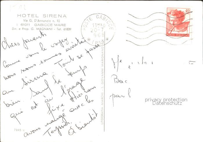old postcard Gabicce Mare Hotel Sirena postalisch gelaufen Erhaltung siehe scans