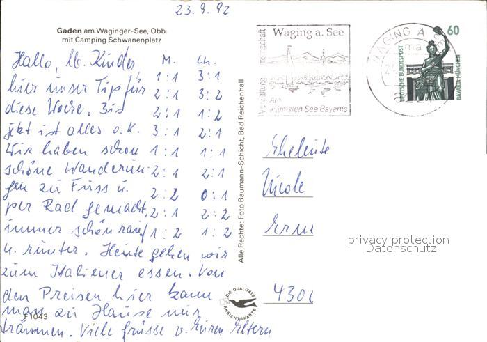 72131379 alte Postkarte Gaden Waginger See Camping Schwanenplatz postalisch gelaufen KatCode: 11110009189162