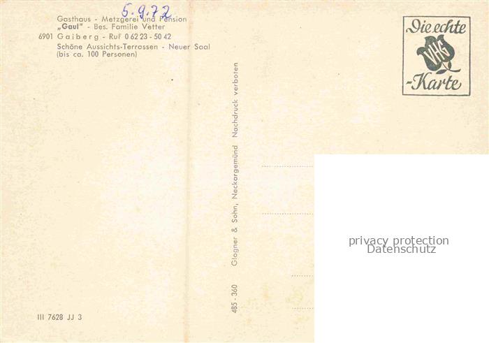 74048511 Gaiberg Baden Heidelberg BW Gasthaus Gaul Terrasse Gastraum Panorama postalisch nicht gelaufen Erhaltung siehe scans [WerneD78] KatCode: 11110008226022