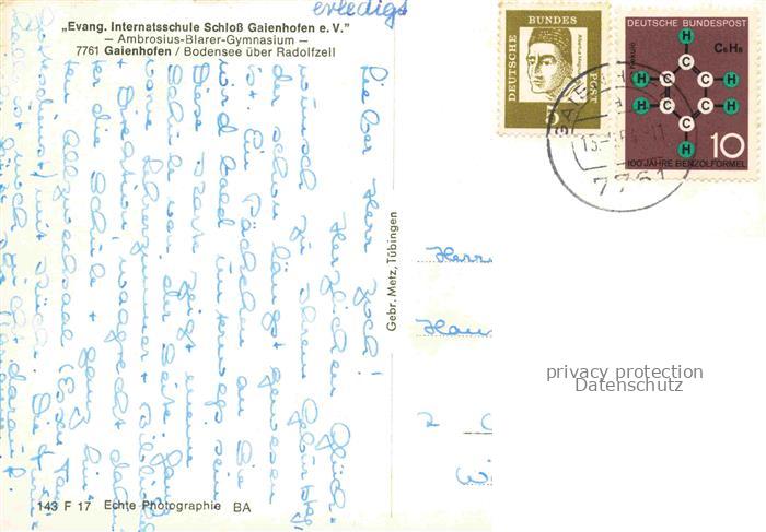 74042602 alte Postkarte Gaienhofen Bodensee BW Ambrosius-Blarer-Gymnasium Evangelische Internatsschule Schloss Gaienhofen e.V. postalisch gelaufen Fliegeraufnahme Erhaltung siehe scans [FriedD77] KatCode: 11110008335025
