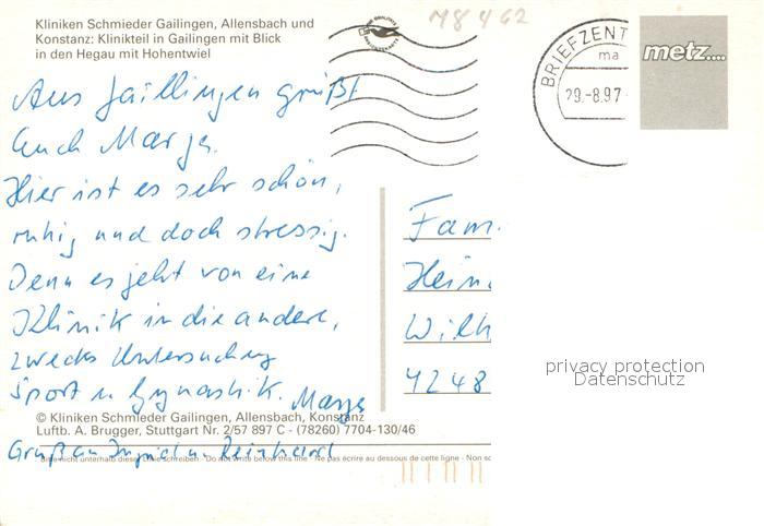 73666608 alte Postkarte Gailingen Kliniken Schmieder mit Hegau Hohentwiel Fliegeraufnahme postalisch gelaufen Erhaltung siehe scans [WerneD78] KatCode: 11110008335026