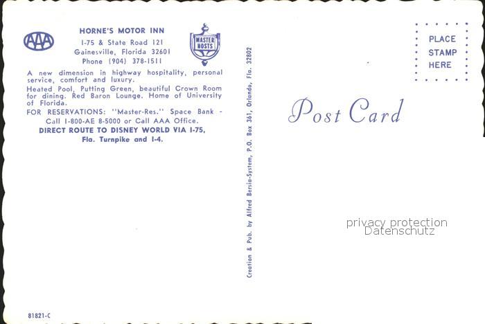 71847860 Gainesville Florida Hornes Motoe Inn postalisch nicht gelaufen Erhaltung siehe scans KatCode: 14140110000000
