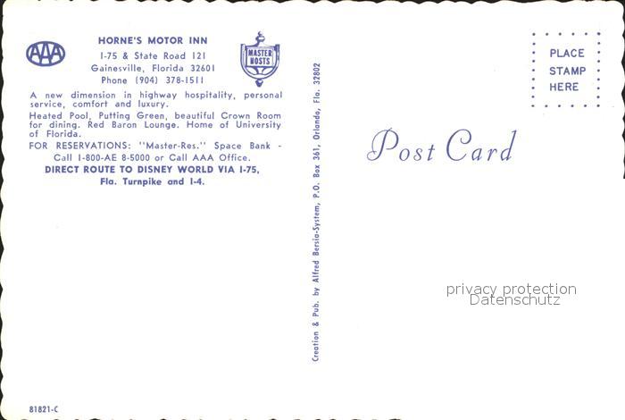 72154791 Gainesville Florida Hornes Motor Inn Swimmingpool postalisch nicht gelaufen Erhaltung siehe scans KatCode: 14140110000000