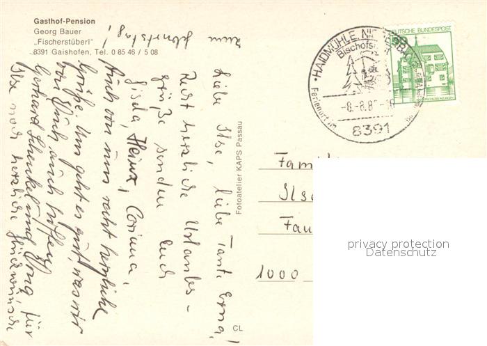 73730770 alte Postkarte Gaishofen Gasthof Pension Fischerstueberl Gaststube Terrasse postalisch gelaufen Erhaltung siehe scans [FriedD77] KatCode: 11110009275159