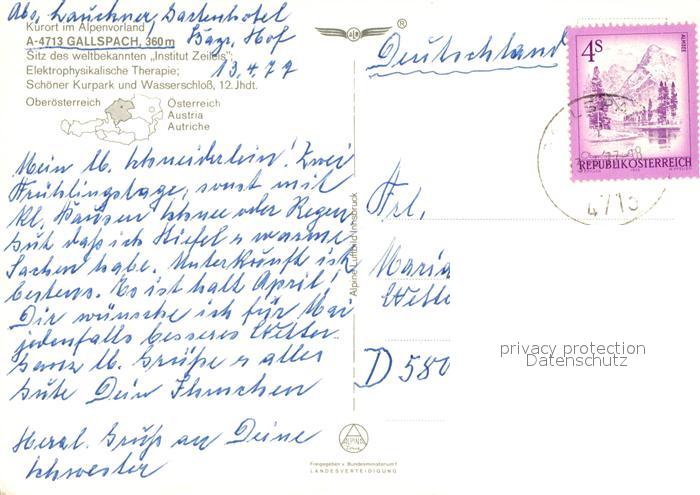13219378 alte Postkarte Gallspach Fliegeraufnahme Kurpark Wasserschloss postalisch gelaufen Erhaltung siehe scans [LiesaD40] KatCode: 11390311040805