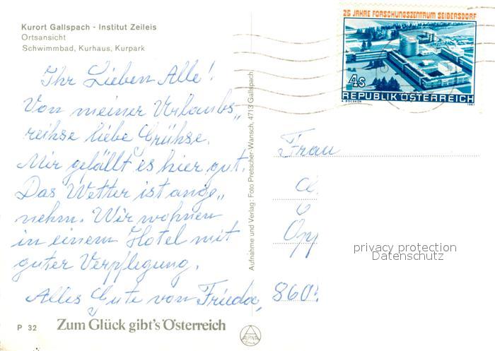 73219531 alte Postkarte Gallspach Gesamtansicht Institut Zeileis Freibad Kurhaus Kurpark postalisch gelaufen Erhaltung siehe scans [FriedD77] KatCode: 11390311040805