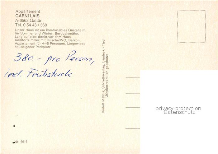73588991 Galtuer Tirol Appartement Garni Lais Gaesteheim postalisch nicht gelaufen Erhaltung siehe scans [FriedD77] KatCode: 11390334070606