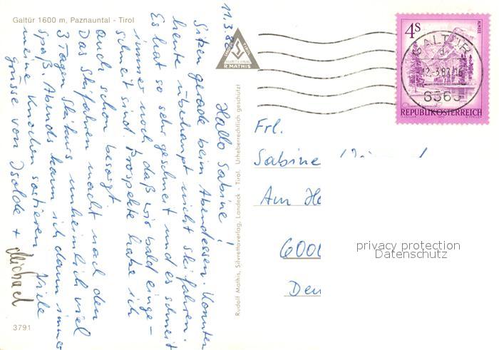 73162076 alte Postkarte Galtuer Tirol Paznauntal postalisch gelaufen Erhaltung siehe scans [PaolaD17] KatCode: 11390334070606