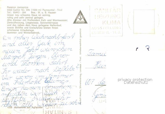 72673188 alte Postkarte Galtuer Tirol Pension Jamspitze Hallenbad postalisch gelaufen Erhaltung siehe scans [WerneD78] KatCode: 11390334070606