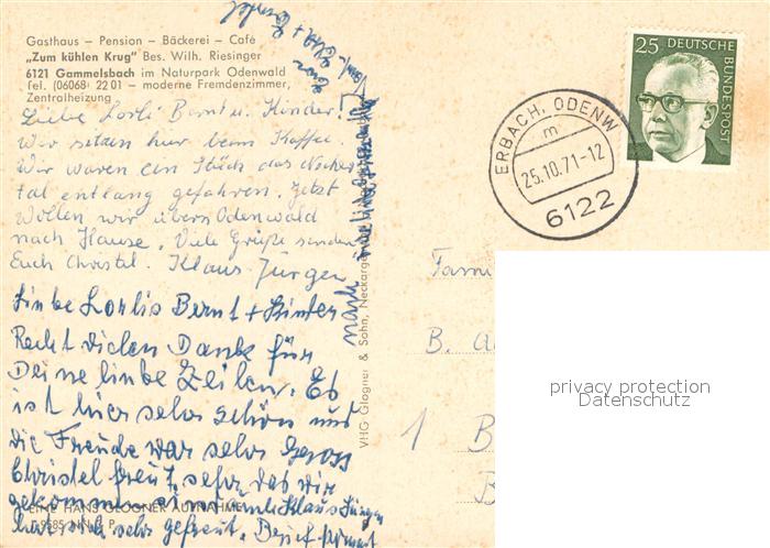 73651166 alte Postkarte Gammelsbach Gasthaus Pension Zum kuehlen Krug Panorama Naturpark Odenwald postalisch gelaufen Erhaltung siehe scans [FriedD77] KatCode: 11110006437002