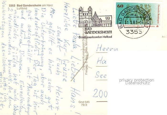 73195965 alte Postkarte Gandersheim Bad Fliegeraufnahme postalisch gelaufen Erhaltung siehe scans [KathaD81] KatCode: 11110003155001