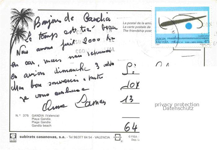 74137906 old postcard Gandia Costa del Azahar ES Playa Gandia postalisch gelaufen Erhaltung siehe scans [WerneD78] KatCode: 11510