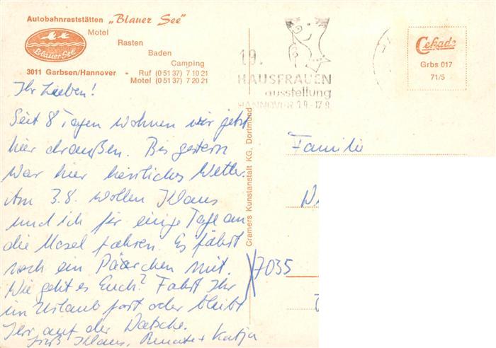 73882620 alte Postkarte Garbsen Lido Blauer See Autobahnraststaette Gastraum Strandpartien postalisch gelaufen Erhaltung siehe scans [WerneD78] KatCode: 11110003241005