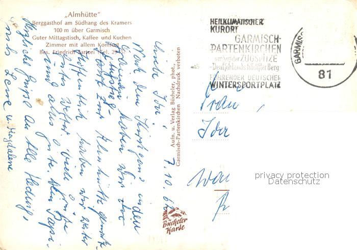 73048211 alte Postkarte GARMISCH-PARTENKIRCHEN Bayern Almhuette Berggasthof am Suedhang des Kramers postalisch gelaufen Erhaltung siehe scans [WerneD78] KatCode: 11110009180117