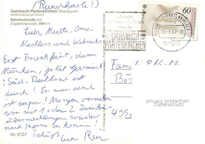 73121776 alte Postkarte GARMISCH-PARTENKIRCHEN Bayern Bahnhofstrasse Zugspitzmassiv postalisch gelaufen Erhaltung siehe scans [KathaD81] KatCode: 11110009180117