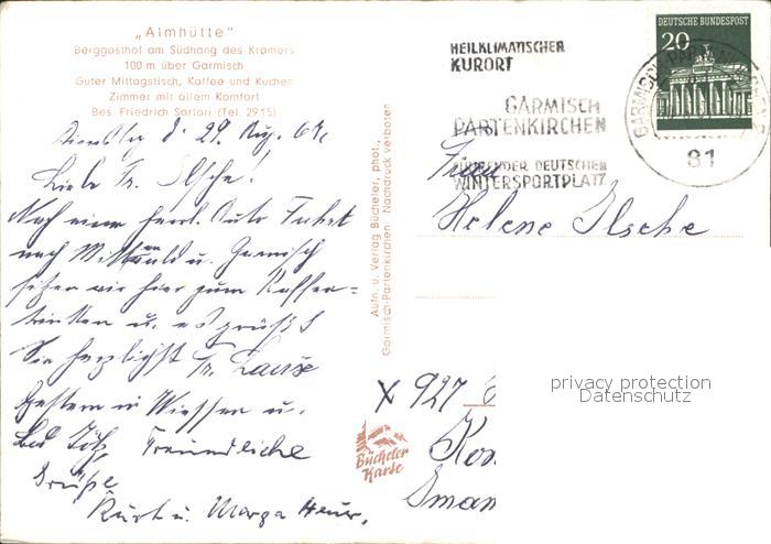 72419037 alte Postkarte GARMISCH-PARTENKIRCHEN Bayern Berggasthof Almhuette am Kramer Ammergauer Alpen postalisch gelaufen Erhaltung siehe scans KatCode: 11110009180117