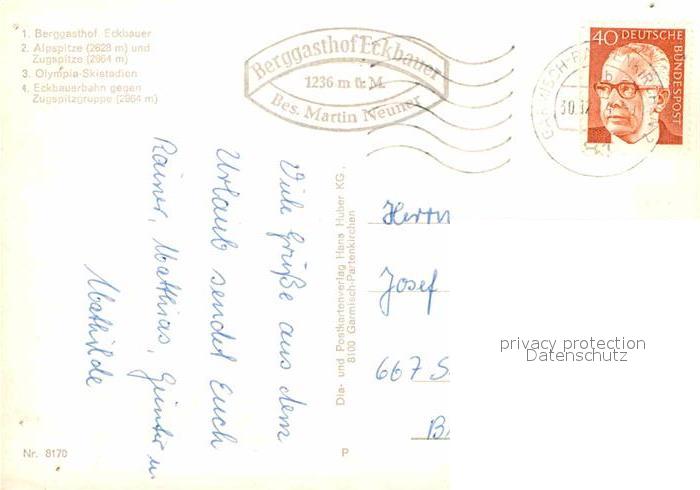 72864113 alte Postkarte GARMISCH-PARTENKIRCHEN Bayern Berggasthof Eckbauer Alpspitze Zugspitze Skistadtion Zugspitzbahn postalisch gelaufen Erhaltung siehe scans [WerneD78] KatCode: 11110009180117