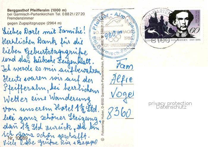 72716804 alte Postkarte GARMISCH-PARTENKIRCHEN Bayern Berggasthof Pfeifferalm gegen Zugspitzgruppe Wettersteingebirge postalisch gelaufen Erhaltung siehe scans [FriedD77] KatCode: 11110009180117